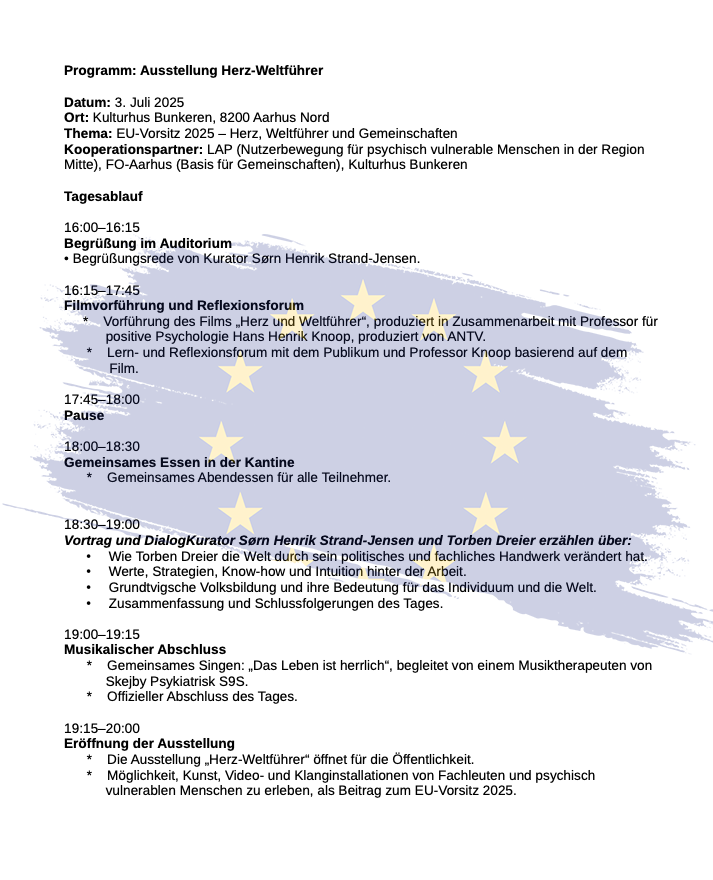Psychisch verletzliche Menschen und Fachleute wie Hans Henrik Knoop, Professor für positive Psychologie, haben dieses Programm als Geschenk an die Welt anlässlich des EU-Vorsitzes entwickelt. Es geht um die Gedanken, Gefühle und Gewohnheiten des Menschen, die die Welt gut, glücklich oder böse machen.