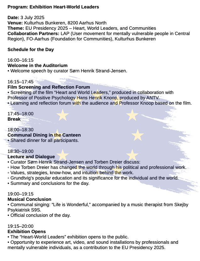Mentally Vulnerable and Professionals’ Contributions to a Better World Join an inspiring evening focusing on hope, community, and heart-based leadership! July 3, 2025, at 4 PM, Kulturhus Bunkeren, 8200 Aarhus N. Host: Sørn Strand Jensen, Heart Society Engineer, at the Heart World Leader event. Partners: LAP, FO-Aarhus, and Kulturhus Bunkeren. Registration mandatory.2025.07.03 Exhibition Heart-World Leaders Kulturhusbunkeren_dk